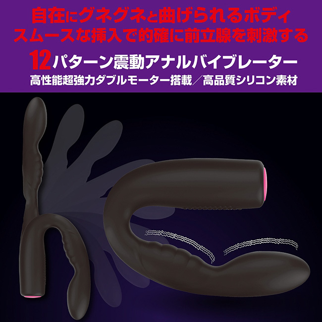 自在にグネグネと曲げることができるフレキシブルバイブレーター「プリティラブ フレキシブルアナルスティック」。女性用としてもお使いいただけますが、主にアナルへの使用を目的として設計されています。本体は180度程度曲げることができ、人によって違う前立腺の位置を的確にとらえてくれます。先端直径が2.4cmとやや太めになっているので、アナルへ挿入した際にしっかりと快感を与えてくれる仕様になっています。操作は、ボタンを押すごとに切り替わる12パターンの振動モードを搭載。あらゆる振動パターンを演出してくれるから、お好きな角度でお好きな振動でドライオーガズムを堪能していただけます。高品質シリコン素材でスムーズな挿入をサポート。静音設計、生活防水機能であらゆるシーンに活躍してくれること間違いなし。